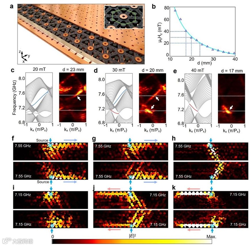 图4展示了通过旋磁光子晶体的实验设置与测量,对多带隙反手性边界态的观测与验证。实验中的旋磁光子晶体被放置在铜制波导中,其上下两侧放置了磁铁用以生成交错的外部磁场。磁场强度随磁铁间距变化的关系曲线如图4b所示。图4c, 4d, 4e展示了通过实验观测的边界态能带,与理论模拟结果高度一致。图4f, 4g, 4h展示了Gap Ⅱ中的边界态电场分布,图4i, 4j, 4k展示了Gap Ⅰ中的边界态电场分布。边界态的空间分布和强度随磁场变化表现出显著的频率依赖性。