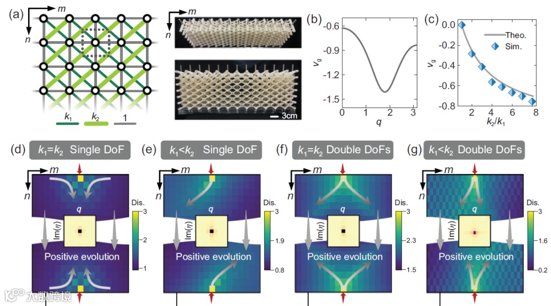 课题组基于时空对偶关系,在静态系统中定义了“波包”、“群速度”等一系列动力学参量。其中,静态波包对应于材料内部一类团簇的变形模式,具有确定的实空间坐标,并可通过边界集中载荷进行激发。而群速度则表征了静态波包在空间演化过程中的偏移率。若一个静态波包的群速度非零,那么它就类似于非互易系统中定向传输的波一样,沿着空间内的某一路径单向聚集,从而实现应力场的导向。这种局部应力场的定向类似于波动力学中波导的概念,我们称之为静态应力波导(stress guide)。值得注意的是,有关静态系统中波包及群速度的定义具有普适性,适用于任何二维/三维周期性力学超材料及一部分连续介质。因此,这种表征材料内局域化变形场的理论是通用的。另外,课题组还揭示了静态系统中点群对称性(如镜面对称)与动态系统中某些内部对称性(如时间反演对称)之间的内禀关联,可通过改变对称性来定制材料的有序变形图案。以此为基础,课题组利用凝聚态物理中的拓扑能带理论,在静力学系统中构造出了非对称的变形阻塞模式,将偏心载荷完全局域在边界处,实现材料内部的静力学屏蔽。