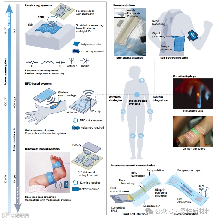 除了传感器和执行器之外,一个独立的生物电子系统还需要电源、数据采集和通信策略。理想的身体区域柔性生物电子网络(bodyNET)将由多模态可穿戴和植入式皮肤电子设备组成,这些电子设备可以独立操作,并通过无线网络连接,向佩戴者提供实时反馈。因此,需要解决无线策略、电源解决方案、皮肤上显示以及互连和封装等实际问题。柔性和可拉伸的电力系统将是皮肤上生物电子系统的理想选择。