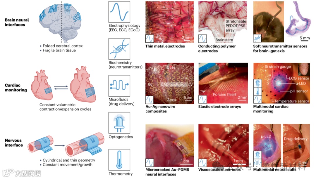 脑机接口在脑部疾病的诊断和治疗中的应用取得了令人兴奋的进展。但主要的挑战是大脑和刚性探针之间的机械不匹配,这会导致组织损伤、疤痕形成以及随着时间的推移感知和刺激性能下降。现有的研究有:以PEDOT:PSS为界面材料,开发了256通道软适神经界面阵列,在不穿透脑表面的情况下测量动作电位和局部场电位(参考文献116);使用柔软且可拉伸的PEDOT: pss电极阵列对啮齿动物脑干模型进行神经刺激(参考文献31)。