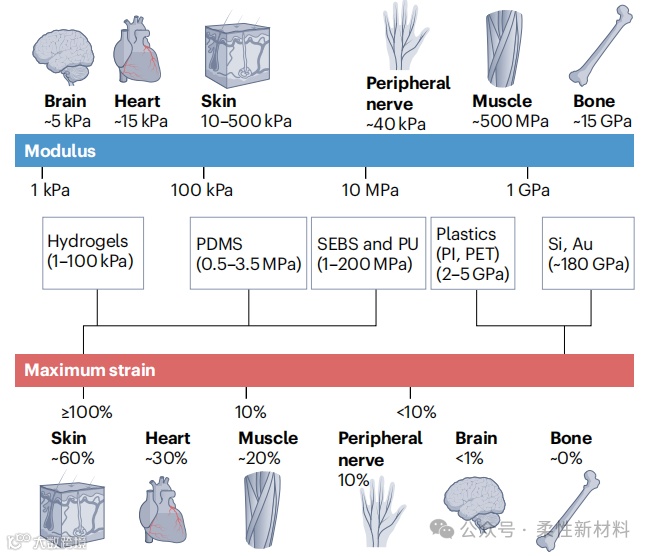 可拉伸性:可拉伸性描述了材料在不破坏或失去其结构完整性的情况下变形的能力。这种特性对于生物电子器件是有利的,因为许多器官和组织在日常生活中经历动态运动和应变。例如,在跑步活动中,人体皮肤通常承受10-15%的压力(最大压力高达60%),心脏在心脏周期中承受20%的压力。即使在脑组织中,呼吸和血管脉动也会产生~10µm范围内的恒定微运动。因此,需要可拉伸的生物电子设备来保持与组织动态运动的保形接触,以实现高质量的记录和刺激。(参考文献249~251)