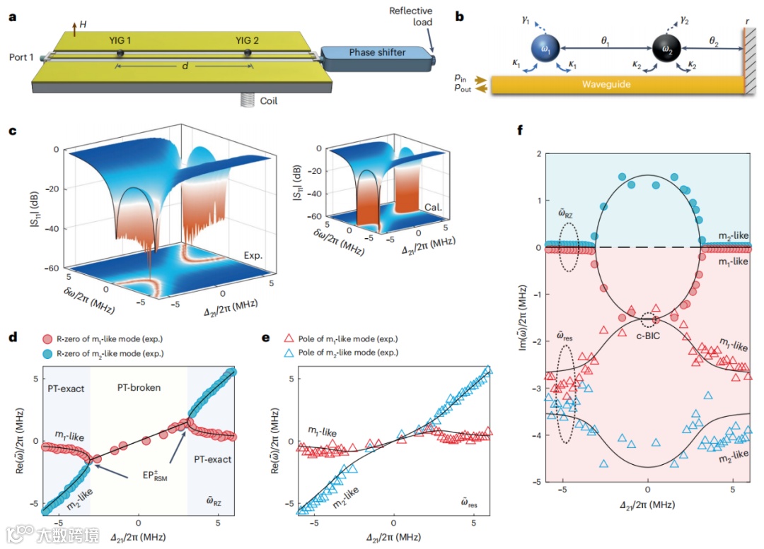 在非厄米系统中实现复数能带拓扑缠绕的主要挑战在于需要精确地调节参数以包围EP点。因此,利用钇铁石榴石(YIG)等磁性有序材料中的自旋激发的磁振子系统成为理想的候选平台。磁振子的优势在于其共振频率高度可调,范围覆盖MHz到GHz,且其模式具备良好的空间局域性,便于控制多模之间的传播相位差。此外,YIG的低固有阻尼(吉尔伯特阻尼)有助于奇异点在接近实频轴的位置生成。