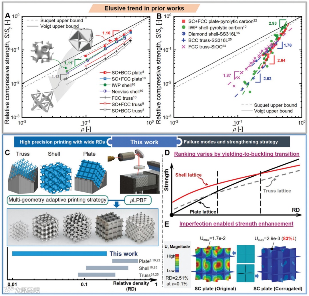 轻量化材料因密度低、单位质量刚度和强度高,在现代工程中至关重要,广泛应用于医疗、汽车、航空航天等领域。通过加入拓扑孔隙,点阵材料应运而生,它们具有均匀的宏观特性,能有效解决密度降低与性能下降之间的平衡问题。定制内部微结构可使点阵材料具备多样的刚强度及能量吸收能力。以“拉伸为主”设计原则旨在接近HS和Suquet的理论上限。过往研究设计了多种桁架晶格,一维杆件限制了承载效率。为此,壳晶格被开发出来,利用更复杂的承载模式,通常优于桁架格。然而,弯曲效应影响其结构效率。最近,板晶格提出,由闭孔网络板组成,能将载荷转化为均匀分布的应力,理论上在低密度时接近性能上限。数值模拟显示:板>壳>桁架的强度趋势,但实验结果与模拟存在差异,尤其在超低密度下。目前,已识别出点阵材料在压缩下的失效模式,如材料屈服和结构屈曲。超低密度时,微结构屈曲先于材料屈服,导致强度显著下降。尽管有少量研究观察到屈服到屈曲的转变,但缺乏系统总结和数值模拟考虑,也未作为设计因素。因此,需更深入地理解超轻点阵材料的力学行为,以优化其性能和应用。