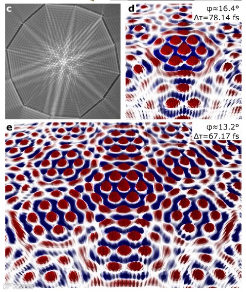 在实验研究中,研究人员利用时间分辨的双光子显微镜技术,对表面等离子激元极化子(SPP)的电场进行了精确测量和重构。结果显示,随着扭转角度的变化,莫尔斯格明子超晶格的单元胞中展现出大的拓扑荷数,形成了“斯格明子袋”结构。该结构对小的角度偏差具有很强的拓扑鲁棒性。数值模拟结果进一步支持了实验观察,展示了不同扭转角度下斯格明子袋的动态演化特性。研究团队指出,“扭转等离子体”方法为生成具有复杂拓扑结构的光场提供了新的理论框架,在超分辨显微技术、量子光学和复杂光-物质相互作用等领域具有重要应用潜力。相关研究成果目前已发布在预印本网站arXiv上。(刘磊)