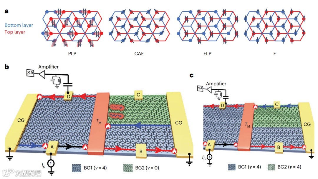 量子霍尔(Quantum Hall, QH)效应是一种在极低温度和强磁场下观察到的现象。近年来,人们对双层石墨烯在零填充因子下的QH状态,尤其是其电荷中性点(ν = 0)表现出的独特行为,表现出极大的兴趣。在这种状态下,双层石墨烯内的电子受到自旋、自旋轨道以及外部电场和磁场等因素的共同影响,形成了复杂的多体基态。这些基态根据不同的自旋和亚晶格排列,可以划分为自旋极化态(ferromagnetic, F)、倾斜反铁磁态(canted antiferromagnetic, CAF)、部分层极化态(partially layer polarized, PLP)和完全层极化态(fully layer polarized, FLP)。尽管这些相均表现出电绝缘性,但CAF和PLP相被预测在低温下会表现出无能隙的激发,允许热流通动,而F和FLP相则存在能隙,因此不允许热流通过。