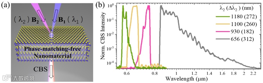 图1 “纳米彩虹”光源的光谱特性。a) 在深亚波长厚度(~100 nm)的纳米材料中,通过差频(DFG)产生超连续光的示意图。“纳米彩虹”光源的厚度显著低于入射光的相干长度,不受相位匹配条件的限制。b) 可调谐的超连续光谱。实验中使用了两束入射光,其中一束的中心波长固定为λ1= 400 nm,另一束的中心波长为Δλ2(可调谐),产生的超连续光的光谱宽度为Δλ2。