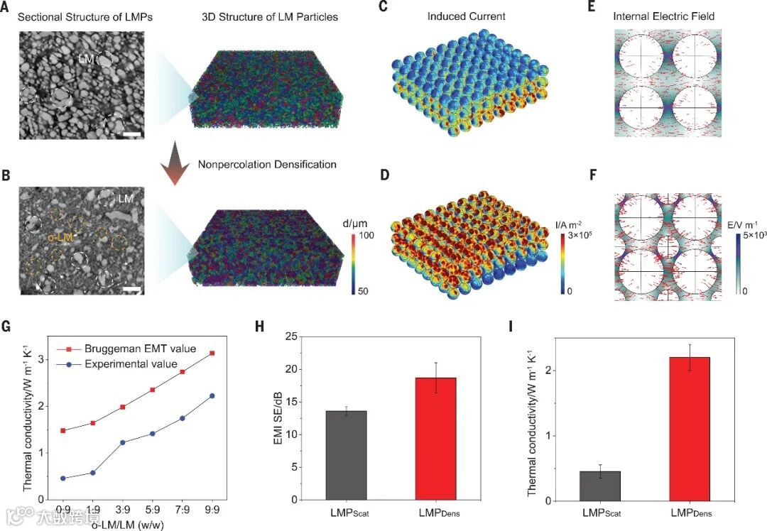 研究了液态金属灌封材料(LMP)的电磁干扰(EMI)屏蔽和导热性能。通常,导电纳米填料需要构建超过趋肤深度的组件来阻挡电磁波,而液态金属由于其流动性和剪切混合性,可形成大于其趋肤深度的球形微粒。通过引入表面氧化的液态金属颗粒(o-LM),增强了LMP的微电容器结构,显著提升了EMI屏蔽效能和热导率。o-LM减少了颗粒间距,增加了填充率,保持高电阻率,并通过增强微电容器数量及其内部电场,加速了电磁波能量的吸收与反射。最终,优化后的LMPDens在2 mm厚度下的EMI SE达到了18.7 dB,热导率为2.2 W m−1 K−1,性能显著优于传统材料(图2)。