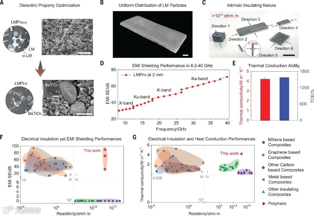 综上,在聚合物复合材料中,将孤立的LM颗粒定义为极性板,将中间基体定义为介电层的微电容器结构。与传统的屏蔽机制不同,板中的电子振荡反射了电磁波,板中的欧姆损耗以及介电层中的偶极子极化吸收了电磁能量,在保持绝缘特性的同时提供了较强的屏蔽能力。通过引入较小的表面氧化的LM颗粒和高介电的钛酸钡纳米颗粒,优化了微电容器-电磁波相互作用和电子-声子传热,集成了高电阻率、突出的EMI屏蔽和卓越的导热性。通过无短路的有效的NF辐射屏蔽和散热性能,验证了该绝缘复合材料的优势,推动了电子产品的集成和缩小规模。