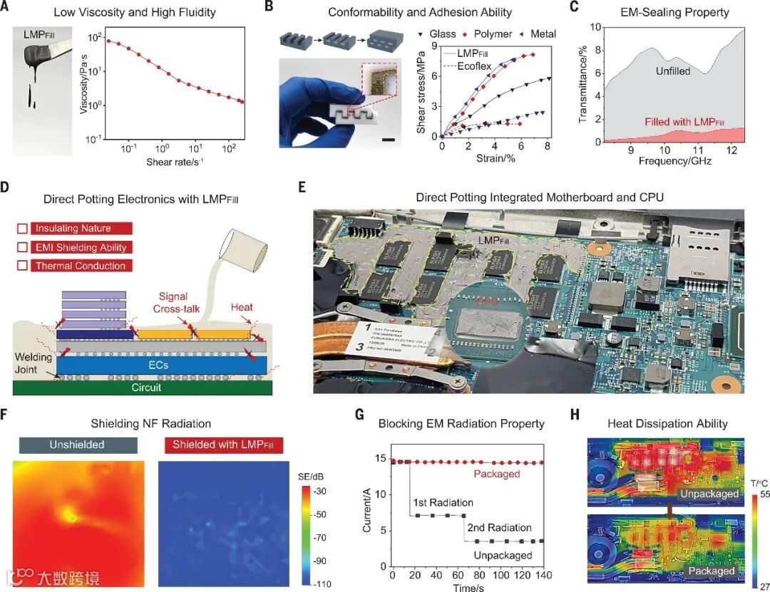 开发了一种基于LMPFill的高效包装技术,用于解决电子设备中的电磁兼容性(EMC)和热量积累问题。与传统的隔室屏蔽不同,LMPFill凭借其绝缘特性和优异的流动性,能够直接灌封电子组件,避免短路风险,实现无缝密封(图4A、4B)。LMPFill的流动性和较低粘度使其可以填充EC的间隙,粘附力强,且能显著降低电磁透射率至<1%(图4C)。其拉伸性和粘附性使其适用于可穿戴设备等动态应用。通过近场扫描技术验证,LMPFill在8至20GHz频率范围内有效防止电磁干扰(图4F)。此外,LMPFill具备良好的导热性,能够快速传导热量,降低主板和CPU温度(图4H),并在高温下保持长期稳定性。其高电击穿强度(~3.0 kV mm−1)确保了在高压设备中的应用,且剪切混合工艺具备工业扩展潜力。