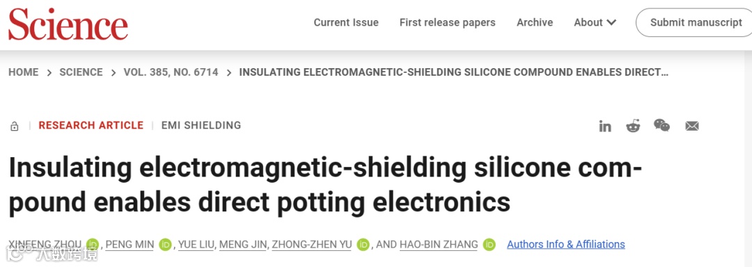 2024年9月12日,相关成果以“Insulating electromagnetic-shielding silicone compound enables direct potting electronics”为题发表在Science上,第一作者为北京化工大学周新峰(博士生),张好斌教授为通讯作者。