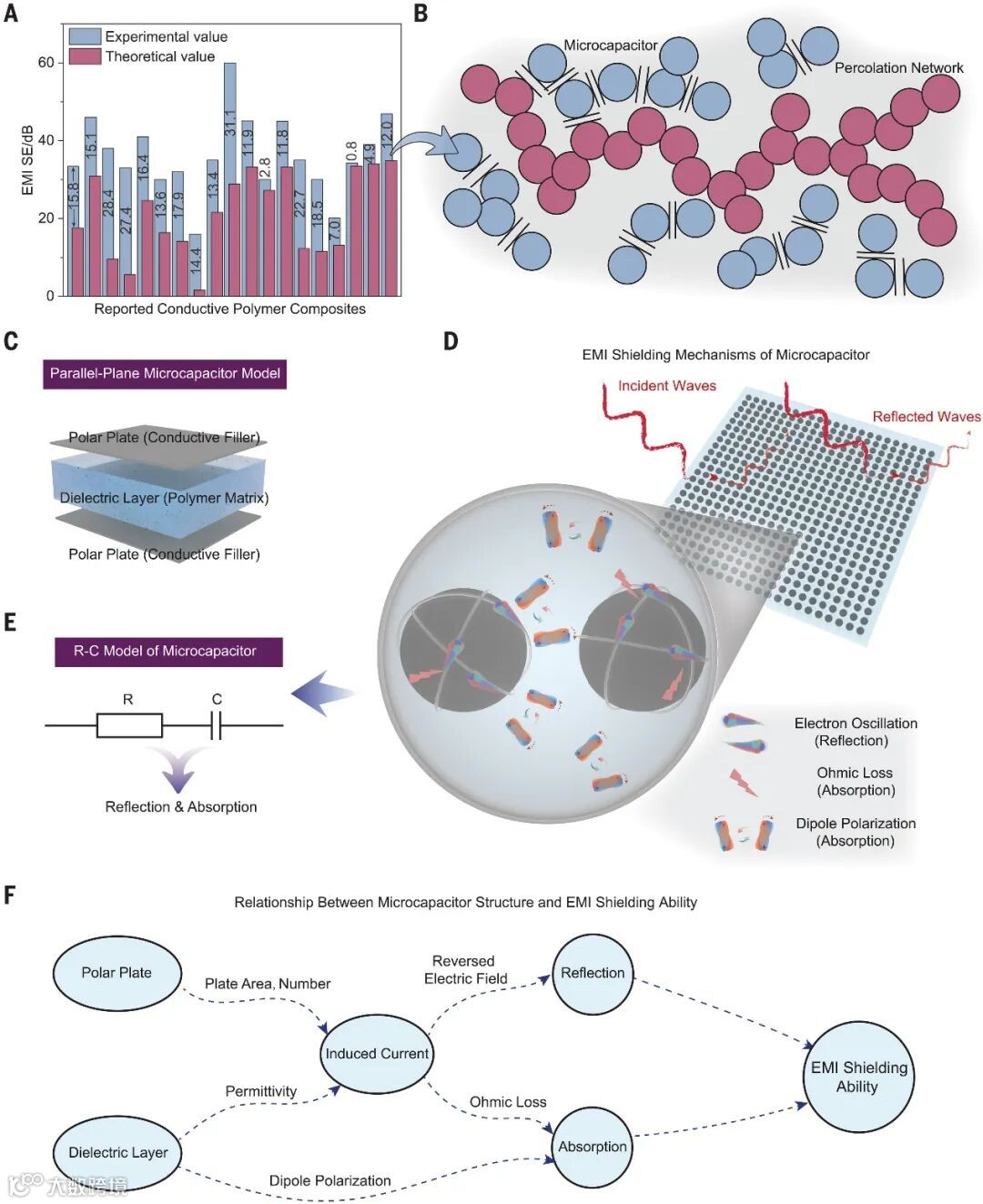 本研究发现实验中的EMI屏蔽效能(SE)值普遍高于Simon方程的理论预测(图1A),这可能归因于复合材料中的绝缘结构也参与了EMI屏蔽作用。除了导电网络,材料中的填料和聚合物基体构成了伪平行板微电容器(图1B、C),这些微电容器通过电磁波耦合来产生屏蔽效应。当导电性降低时,绝缘微电容器逐渐增多,进一步增强屏蔽能力。极板中的电子振荡和介电层中的偶极子极化相互作用,阻止电磁波传播,同时将电磁能转化为热量。通过增加极板面积、数量和介电常数,可以优化这些微电容器的EMI屏蔽性能(图1F),为解决电绝缘与EMI屏蔽之间的矛盾提供了新的途径。
