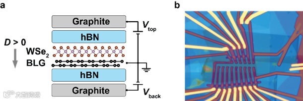 2021年,研究者首次在不需要莫尔超晶格的亚稳态单晶石墨烯,即菱方堆垛的三层石墨烯中,通过栅极静电调控,观察到空穴掺杂的超导现象,其超导转变温度约为100 mK,这一研究结果也马上引起了广泛的关注。随后,2022年,在施加约0.15 T平行磁场和垂直位移电场(约1 V/nm)的条件下,人们在空穴掺杂的Bernal堆垛双层石墨烯也观察到了超导态,但其超导转变温度仅约为30 mK. 不同于魔角石墨烯和菱方堆垛石墨烯系统,Bernal堆垛的双层石墨烯是天然石墨的基本组成单元,是一种稳定的晶体结构,这为可控制备高质量样品、以及未来研制基于石墨烯的新型超导量子器件提供了理想的实验平台。之后的研究发现,将半导体过渡金属硫族化合物二硒化钨(WSe2)与Bernal堆垛的双层石墨烯组合形成异质结构时,由于近邻效应,增强了石墨烯体系的自旋轨道相互作用,有趣的是,这使得双层石墨烯的超导态能在零磁场下显现,并且超导转变温度被显著提升至约300 mK. 但由于实验中可实现的位移电场范围的限制,无法完全揭示双层石墨烯空穴超导态随位移电场变化的性质与规律;而且,其超导配对机制以及二硒化钨对石墨烯系统超导态的影响机制仍是悬而未决的问题。此外,之前有关高质量双层石墨烯器件中自发对称性破缺态和超导态的研究主要集中在价带(空穴掺杂),而对导带(电子掺杂)的关注较少。
