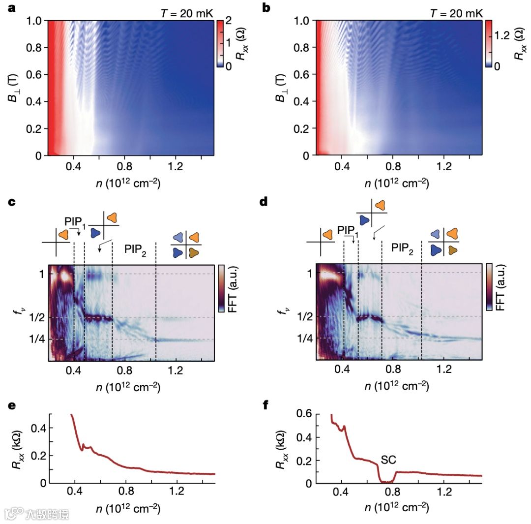 通过测量高质量石墨烯样品的纵向电阻随垂直磁场的量子振荡(即Shubnikov-de Haas效应,简称SdH振荡),可以得到有关能带费米面的重要信息,这对于理解体系中由于电子关联相互作用导致的自发对称性破缺态,以及超导配对机制等都具有重要的意义。该研究工作详细测量了在不同位移电场下,低磁场区间空穴掺杂和电子掺杂时的SdH振荡。分析结果表明,在较高的位移电场下,双层石墨烯在空穴掺杂和电子掺杂时均出现了一系列自发对称性破缺态,这些态的出现与能带的范霍夫奇点以及电子-电子相互作用相联系。特别地,当施加电场使得双层石墨烯中的电子或空穴靠近二硒化钨层时,SdH振荡的频率发生了进一步的变化,这是因为当电子和空穴靠近二硒化钨层时,感受到了明显的自旋轨道耦合作用,从而导致电子态的简并度和费米面的结构发生变化。实验结果表明,空穴掺杂和电子掺杂的超导的正常态均对应于费米面为部分极化的情况。