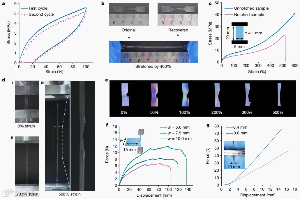热后固化效果显著。在最佳后固化时间为6 h时,其模量为26.1±2.7 MPa,抗拉强度和断裂应变分别达到94.6±2.8 MPa和909±11%,对应的拉伸韧性为310.4±7.4 MJ m−3。与任何已知的高性能3D打印弹性体(图2b)相比,强度至少高出3.7倍。