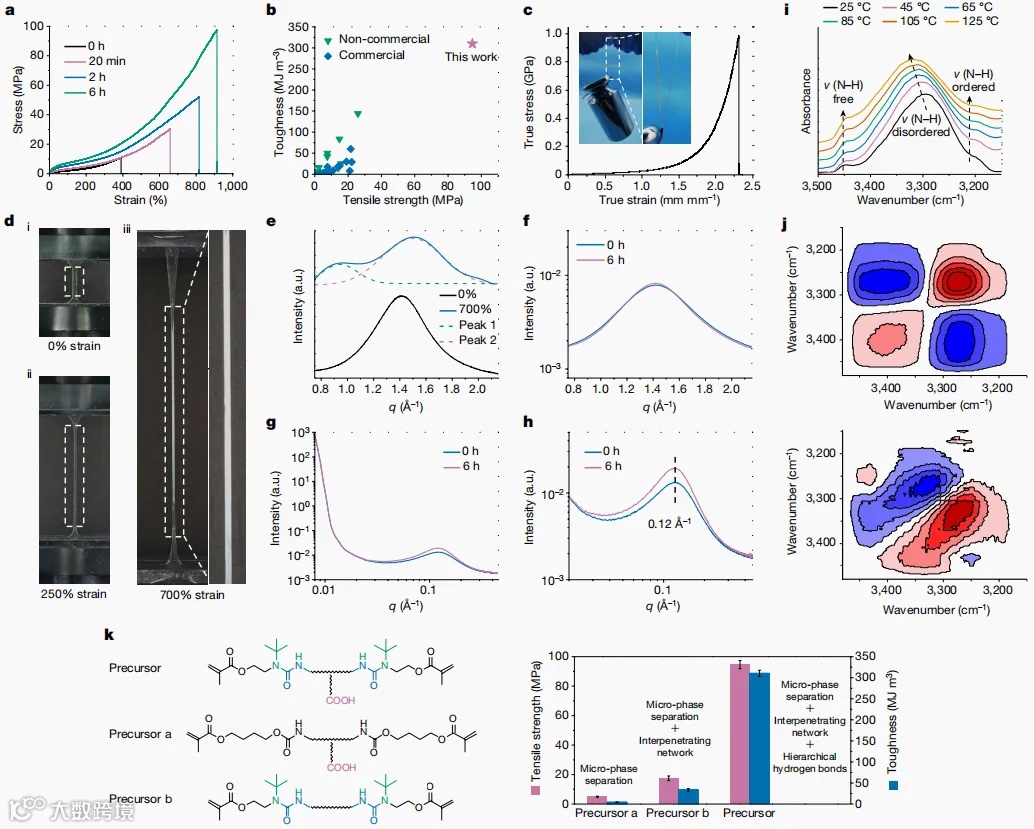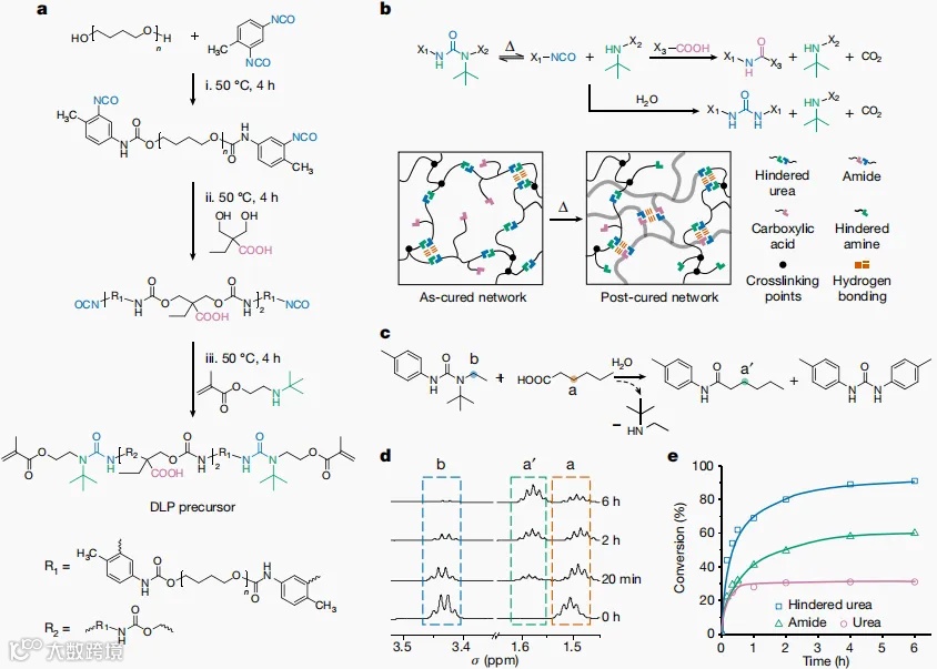 这一成果的关键在于化学设计了一种二甲丙烯酸酯DLP前驱体,其主链上含有动态受阻脲和两个羧基。该前体分三步合成(图1a)。低聚聚(四氢呋喃)二醇(分子质量为1000)首先与甲苯-2,4-二异氰酸酯反应,引入异氰酸酯端基。在第二步中,异氰酸端基进一步与二甲基丁酸反应,生成具有两个悬垂羧酸基的异氰酸端基预聚物。这里选择50℃的反应温度,促进异氰酸酯与羟基的反应,抑制异氰酸酯与羧基的反应。第三步,预聚物与2-(叔丁胺)甲基丙烯酸乙酯反应生成DLP前驱体,并通过质子核磁共振(1H NMR)和傅里叶转移红外(FTIR)光谱分析证实其结构。凝胶渗透色谱和1H NMR端基分析测得的DLP前驱体的数平均分子量分别为4277 g mol−1和4740 g mol−1。这两个值都符合理论数平均分子量为4,710 g mol−1。