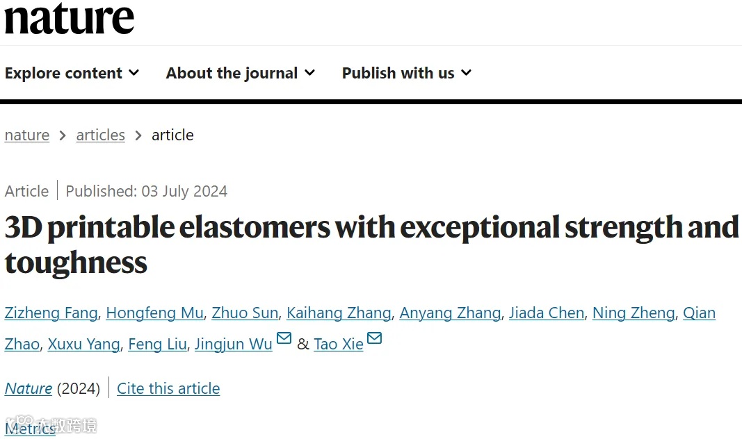 2024年07月03日,相关论文以题为“3D printable elastomers with exceptional strength and toughness” 发表在Nature上。论文的第一作者是浙江大学杭州科创中心方子正研究员。浙江大学宁波科创中心吴晶军研究员与浙江大学化工学院谢涛教授为共同通讯作者。研究受到了国家自然科学基金的资助。