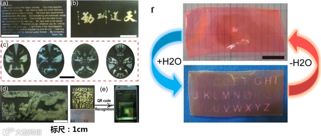 图2. 利用GE-DLP 构筑的任意水凝胶图案(a)精细文本,(b)中文书法,(c)川剧变脸,(d)《清明上河图》和(e)快速识别码(QR-code)及水化和去水化过程中的可逆显现。