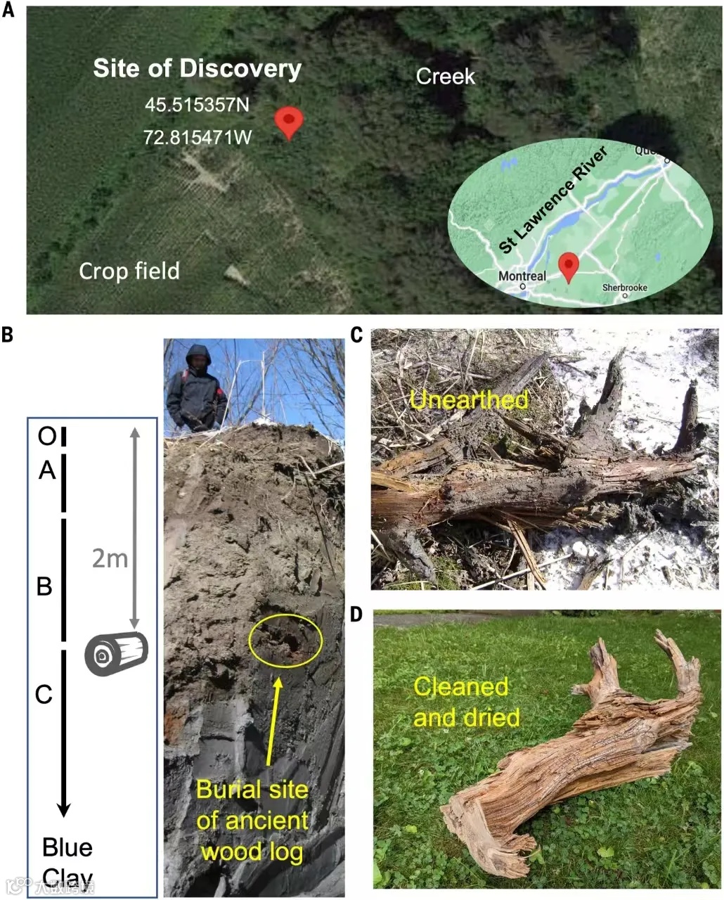 这根原木的碳-14 测定年代为 3775 年(见材料和方法),很可能沉积在圣劳伦斯洪泛平原并被自然掩埋。(A) 遗址位于蒙特利尔以东 50 km处的圣劳伦斯河谷。(B) 壕沟,显示古圆木在地表下 2 m处留下的洞。图中还显示了带有标准土壤层的土壤剖面:O,0 - 0.1 米的地层;A,0.1 - 0.7 m的地层;B,0.7 - 2 m的地层;C,2 m以上的地层,为蓝色粘土(母质)。(C) 刚挖出并掉在地上的古原木,树皮仍有部分附着。(D) 清理并晾干的古原木,下端被锯掉以备实验室分析。