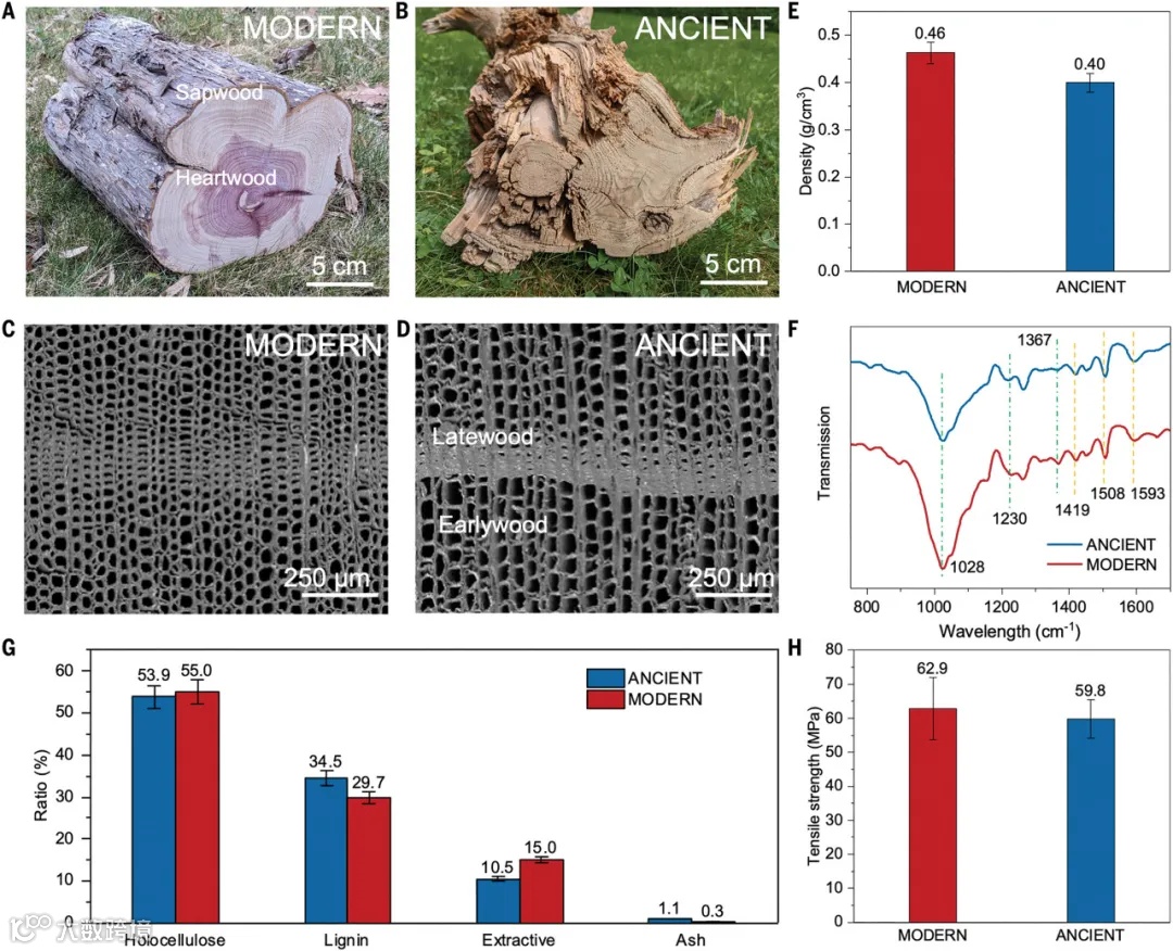 (A) 现代红雪松。(B) 古红雪松(3775 年树龄)。(C 和 D) 扫描电镜横截面图像。(E) 密度。(F) 傅立叶变换红外光谱。(G) 全纤维素、木质素、萃取物和灰分相对于木材总质量的质量比。(H) 现代样本和古代样本的抗拉强度。