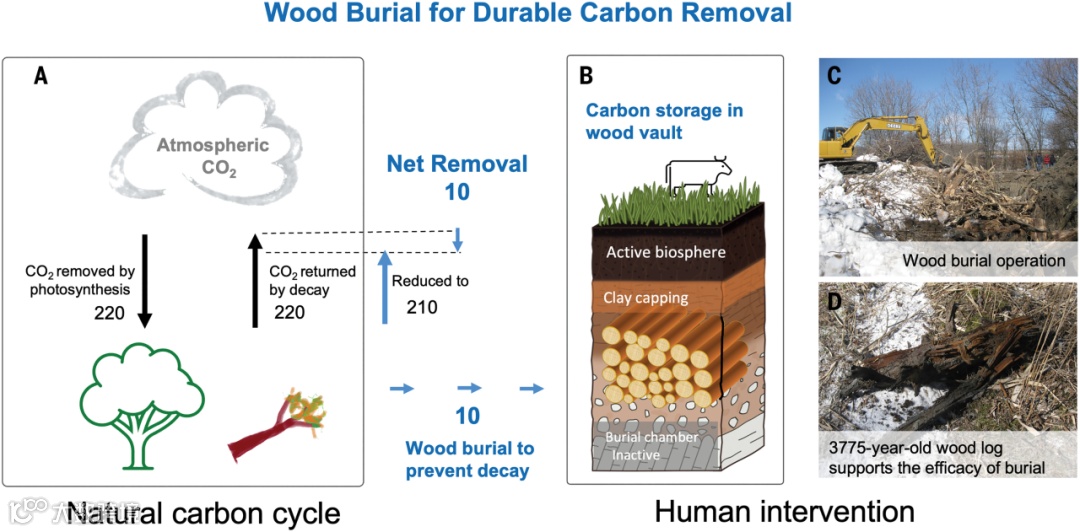 (A) 在自然界的陆地碳循环中,陆地光合作用每年产生的 NPP 为 220 Gt CO2 yr-1,但大部分被腐烂和分解所平衡,因此CO2的净去除量几乎为0。(B) 我们可以将多达 10 Gt CO2 yr-1(NPP 的 4.5%)的CO2埋入木拱顶,这种结构可以防止腐烂,从而净去除相同数量的 CO2。(C)2013 年在蒙特利尔附近进行的木材掩埋示范实验。(D)在挖掘坑道时发现了一根有 3775 年历史的古木,证明了将木材埋在低渗透性土壤中防止腐烂的功效。黑色箭头代表自然碳通量,蓝色箭头代表人为干预造成的碳通量。碳通量单位为 Gt CO2 yr-1。