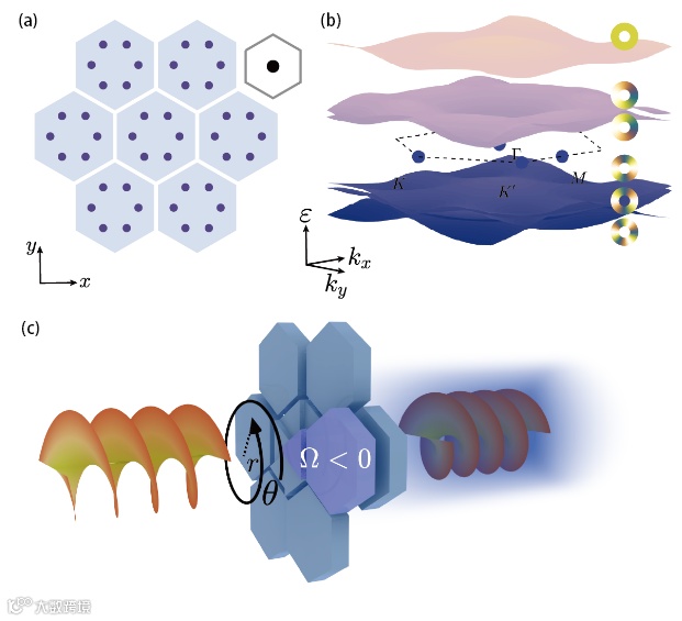 图2 三角晶格中旋转缺陷与轨道规范场的关系,以及在能隙中涡旋态的束缚传输