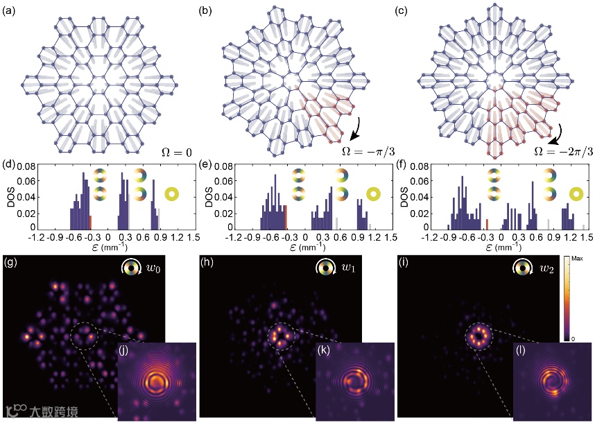 在三角晶格中,随着图2中插入缺陷的弗兰克角扩大,晶格结构中的旋转规范变换带来的轨道规范场逐渐增强,在体能带的间隙中逐渐形成远离体态的涡旋简并态。在轨道规范场的束缚下,携带轨道角动量l = 0,+/-1,+/-2的轨道模式局域在晶格中心,而携带轨道角动量l = 3的轨道模式淹没在体态里。在涡旋光的实验测试中,研究团队验证了随着轨道规范场的增强,l = 2的高阶涡旋光逐渐被束缚在初始位置,几乎不扩散到体内晶格,并保持着完好的轨道角动量属性。轨道规范场构建出一条用于高阶涡旋光传输的理想信道。