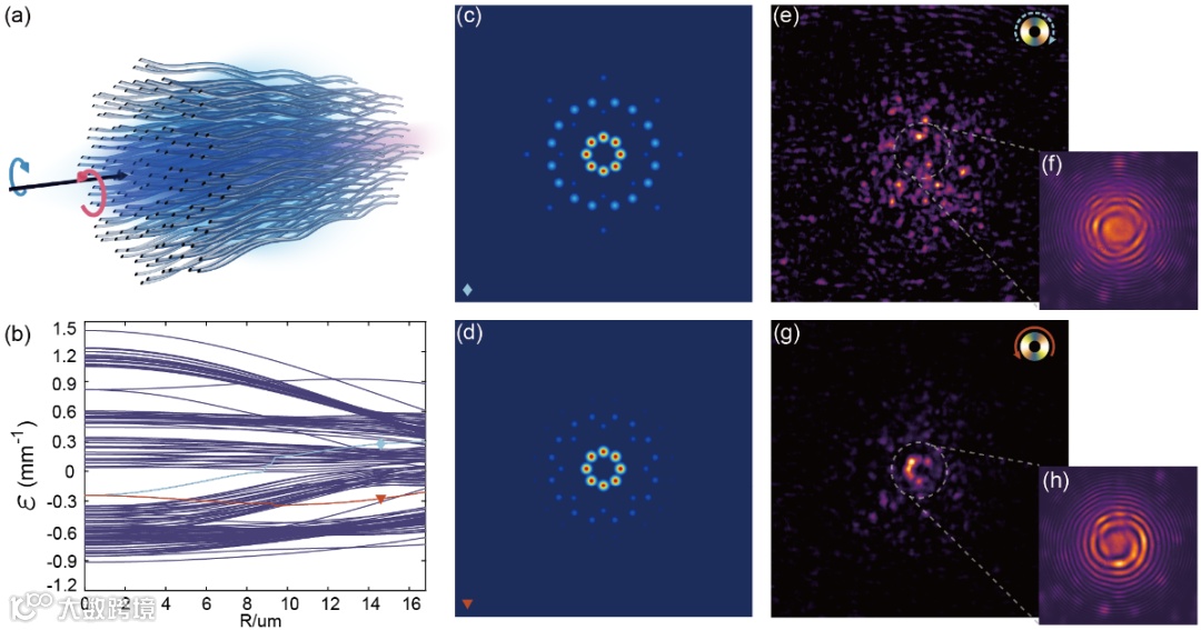 如果在晶格中引入时变的矢量势场,轨道规范场的时间反演对称性会被破坏,因此在哈密顿量中与规范场作用的轨道狄拉克算符不再互相对易,在图3能隙中的涡旋束缚态将不再简并。在实验中,分别携带轨道角动量l=+2和l=-2的涡旋光分别呈现差异化的行为,前者扩散到晶格体内,而后者束缚在规范场中心,其与最近所报道的轨道霍尔效应具有类似的手性传输特性。