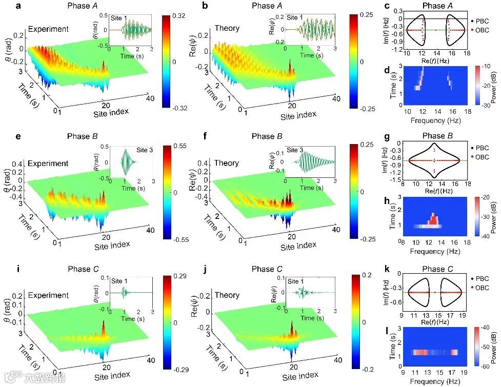 作者在动力学A、B和C相中各选择了一组参数进行实验测量和分析,通过一个覆盖宽频范围的短脉冲,揭示了全频谱的动态特性。在三个相的时空演化中都清晰地观察到波向单向传播的趋势,这证实了动力学NHSE。此外,在A相中存在明显的拍频模式(见图2a、b插图),这种现象源于两个主导模式(具有最大虚部本征频率)的实本征频率之间的线隙。然而,拍频模式并没有在B和C相中出现。这因为B相是无能隙的,它只有一个主导模式,因此动力学演化很快显示出典型的单频振荡行为和阻尼(图2e、f插图)。在C相中,由于(在没有损耗的情况下)能谱纯实和短脉冲激发,许多模式参与了动力学,这些模式之间的复杂干涉破坏了任何可能的拍频模式。这些结果也通过OBC能谱以及短时傅里叶变换得到了验证(图2c、d、g、h、k、l)。