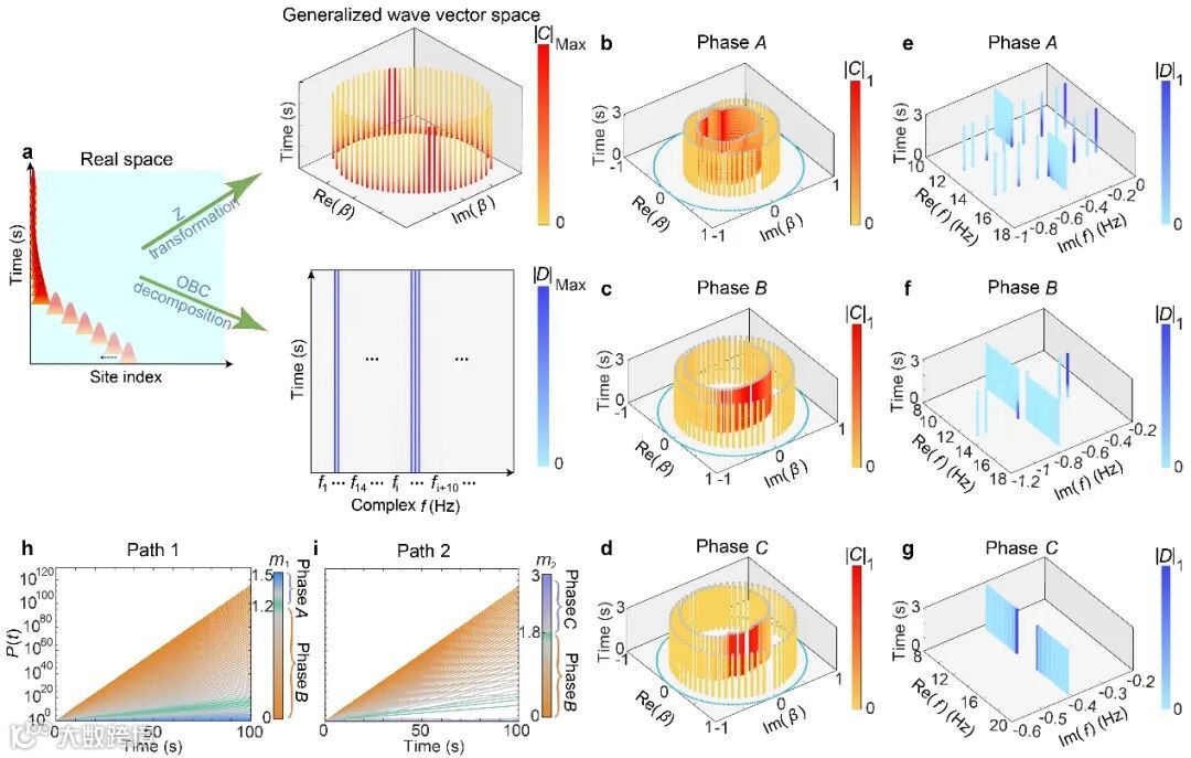 作者提出非厄米动力学是由NHSE和OBC能谱共同作用决定的,两者都与GBZ有关。为了更好地阐明其中的物理机制,作者进行了以下分析。首先,作者对不同时刻测量的空间波函数进行Z变换,并将其投影到形成GBZ的广义波矢β上(图3a)。从三个相的Z变换结果可以看出,主导动力学的波函数显然是那些具有小|β|的波函数——这是趋肤效应在动力学演化中占主导地位的明显证据。其次,为了揭示特征频率虚部在动力学中的作用,作者将不同时刻测量的空间波函数分解到OBC本征模上(图3a)。在A、B相的结果中,OBC能谱中的演化收敛到具有最大虚部特征频率的模式。对于C相,所有OBC特征频率(在没有损耗的情况下)都是实数,演化会收敛到接近线隙边界的模式,这些模式也是具有最小|β|。最后,通过沿相图中的两条路径并结合P(t)的振幅,研究了不同动力学相之间的转变。作者强调,沿路径1的P(t)变化是平滑的(见图3h),反映了B相和A相都是强动力学相。然而,沿路径2从B相到C相的转变在t较大时P(t)值快速变化(见图3i)。事实上,这种相变是从非布洛赫PT破缺相到非布洛赫PT对称相的转变,也可以通过Lyapunov指数(见附录)刻画。这一特征与C相是弱非厄米动力学相的事实一致。