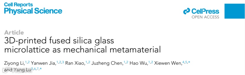 该成果以“3D-printed fused silica glass microlattice as mechanical metamaterial”为题发表于国际期刊《Cell Reports Physical Science》上,课题组2020级博士研究生黎子永为该论文第一作者。