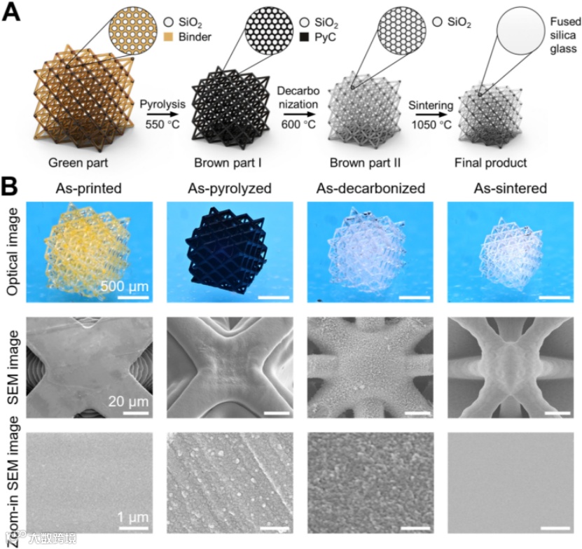 图1:3D打印玻璃微点阵力学超材料的制备示意图。(A)通过多步后处理过程,将打印所得的二氧化硅-聚合物纳米复合前驱体逐步转化为高质量、无缺陷的透明石英玻璃。(B)各阶段下微点阵结构对应的光学和扫描电子显微镜图像。