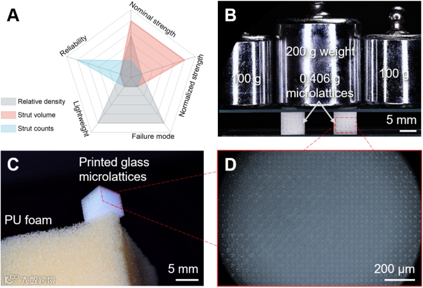 图3:通过在透明玻璃微点阵力学超材料中实现轻量化和高强度特性。