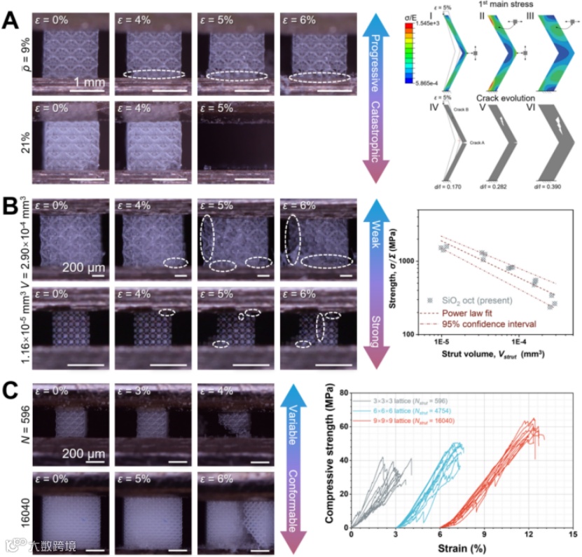 图2:不同拓扑构型下玻璃微点阵超材料的力学行为。(A)相对密度所主导的力学行为:随着相对密度的增加,玻璃微点阵超材料破坏模式从逐层破坏转变逐步演变为灾难性的脆性断裂模式;根据有限元模拟结果显示,该转变由裂纹在基体中沿不同方向扩展机制所决定。(B)特征尺寸所主导的力学行为:通过 均匀减小杆件特征尺寸,可以有效增强玻璃微点阵超材料的整体机械性能,包括结构标称强度和归一化材料强度,符合“越小越强”现象。(C)单元数量所主导的力学行为:通过增加单元数量,可以有效减轻边缘效应,并提升特征变化的均质性和独立性,从而显著提高玻璃微点阵超材料的可靠性和一致性。