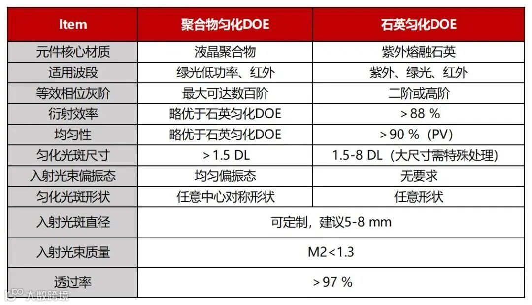 匀化DOE因其独特性能及多样化的应用前景备受关注,当前,市面上常见的匀化DOE类型主要分为两种——聚合物匀化DOE和石英匀化DOE,这两种匀化DOE各自拥有不同的特点与优势,主要区别在于: