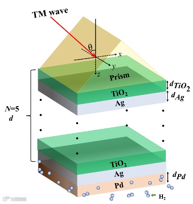 研究团队首次提出将HMM用于氢气探测,解决Pd薄膜的厚度对探测性能的限制。这里,HMM由一对TiO2/Ag层组成,这些层以周期N = 5的单位循环排列。在图中,dAg和dTiO2分别是Ag和TiO2的厚度,HMM的总厚度设置为d。为了更好地激发HMM中的体共振模式,使用了折射率为2.3的棱镜。实现氢检测的功能关键,在HMM层下方添加了一层氢敏感材料Pd,用于将氢的检测转化为Pd金属折射率的变化,并以光学方式呈现。需要强调的是,通过计算优化,结构中Pd薄膜的厚度(记为dPd)仅为0.015 μm。这种超薄设计确保了传感器的可靠性。