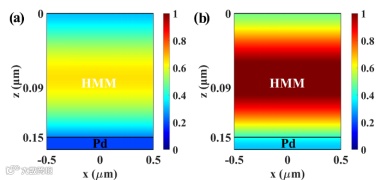 为了深入解析实现高灵敏度探测的原因,研究团队计算了氢通入前后结构的归一化电场,以更全面地了解电场变化。从图(a)中可以清楚地观察到一个宽的强局域场,这种现象可以用BPP的激发来解释,这使得能量高度集中在HMM结构的中心。强局域场阻挡了光子的传播,大大降低了反射率,实现了完美的吸收。然而,如图(b)所示,氢气通过后,结构中的局域场显著降低,导致传感器的吸收减少。因此,高灵敏度的原因之一是BPP的激发产生了一个强的局域场,它对氢化后Pd薄膜光学性质的变化极其敏感,导致吸收发生显著变化。