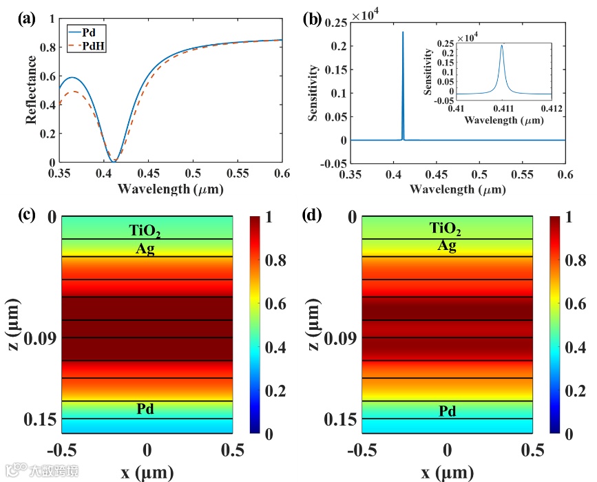 图4精确计算等效结构的归一化场图。(a)对于0.011μm的Pd膜厚度,在4 vol.%氢气下传感器泄漏前后的反射光谱;(b) 当暴露于4体积%的氢气时,传感器的灵敏度光谱。(c)以及(d)氢化前后Pd膜的归一化电场图(HMM层由交替排列的TiO2/Ag单元组成,周期为5)。