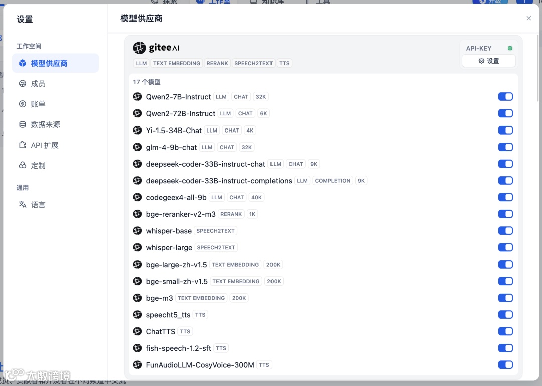 Gitee AI 共提供了 17 个模型供开发者们调用,涵盖了文本生成、文本补全、文本嵌入、重排序、语音转文本、文本转语音等多个应用领域。