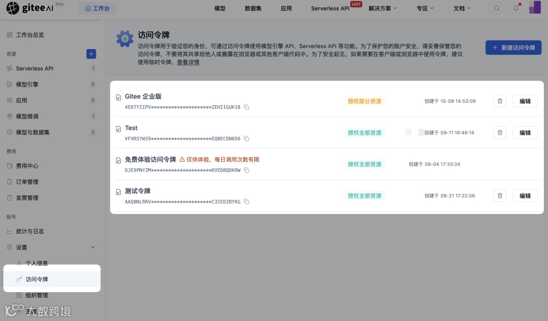 开发者首先需要访问 Gitee AI 工作台中获取访问令牌,没有购买 Serverless API 的开发者,可以使用免费体验访问令牌(仅供体验,每日调用次数有限),复制想要使用的令牌即可。