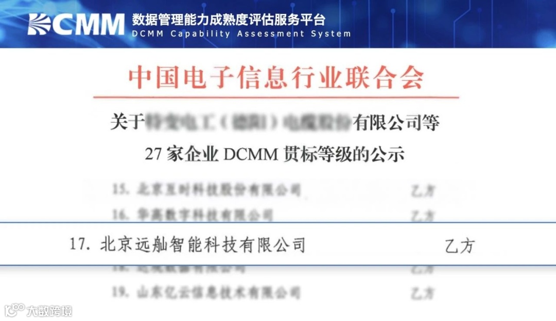 近日,依据国家标准《数据管理能力成熟度评估模型》(GB/T 36073-2018,DCMM),经专家评估,远舢智能数据管理能力成熟度达到乙方稳健级(3级)。本次成功贯标,彰显了远舢智能作为数据解决方案提供商在信息技术服务和产品研发方面的强劲实力,标志着远舢智能数据管理和应用能力已处于行业领先水平。