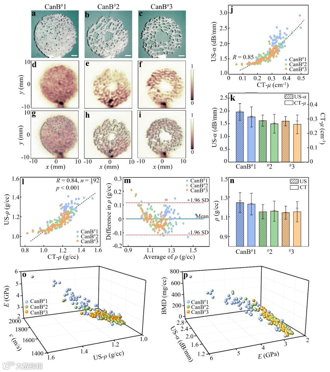 图4. 基于柔性超透镜超声成像的骨质疏松状况多参数评估。a-c,健康基质、骨质减少和骨质疏松的3片松质骨组织切片样本;d-f及g-i,对应的组织超声图像及真实样本轮廓映射图;j-k,超声成像技术与Micro-CT测得的衰减系数相关性分析结果;l-n,超声成像技术与Micro-CT测得的组织密度相关性及差异性分析结果;o,柔性超透镜超声成像方法所构建的组织密度、声速、杨氏模量三维参数分析结果;p,骨密度、超声衰减量、杨氏模量三位参数分析结果,可提供骨质状态的弹性、密度等多参数信息。