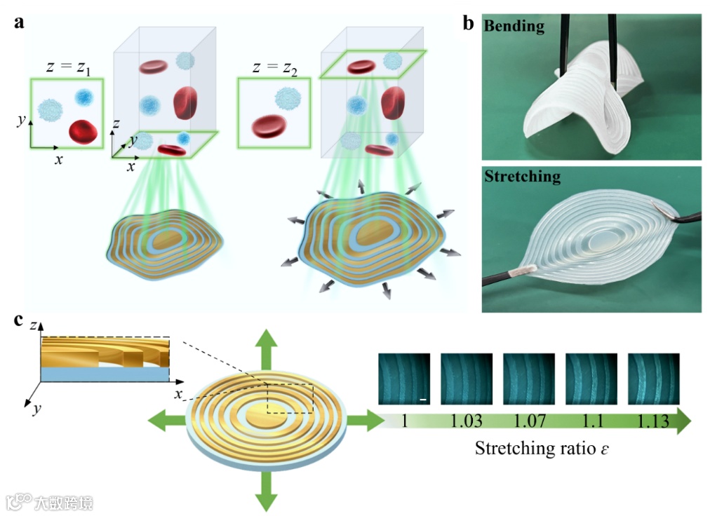 图1. 基于柔性超透镜的超声变焦成像方法,其具有亚波长成像分辨率和灵活可调的成像深度。a, 柔性变焦超声成像示意图;b, 弯曲及拉伸状态下的柔性超透镜;c, 显微镜下观测在不同拉伸程度下的柔性超透镜几何构型。