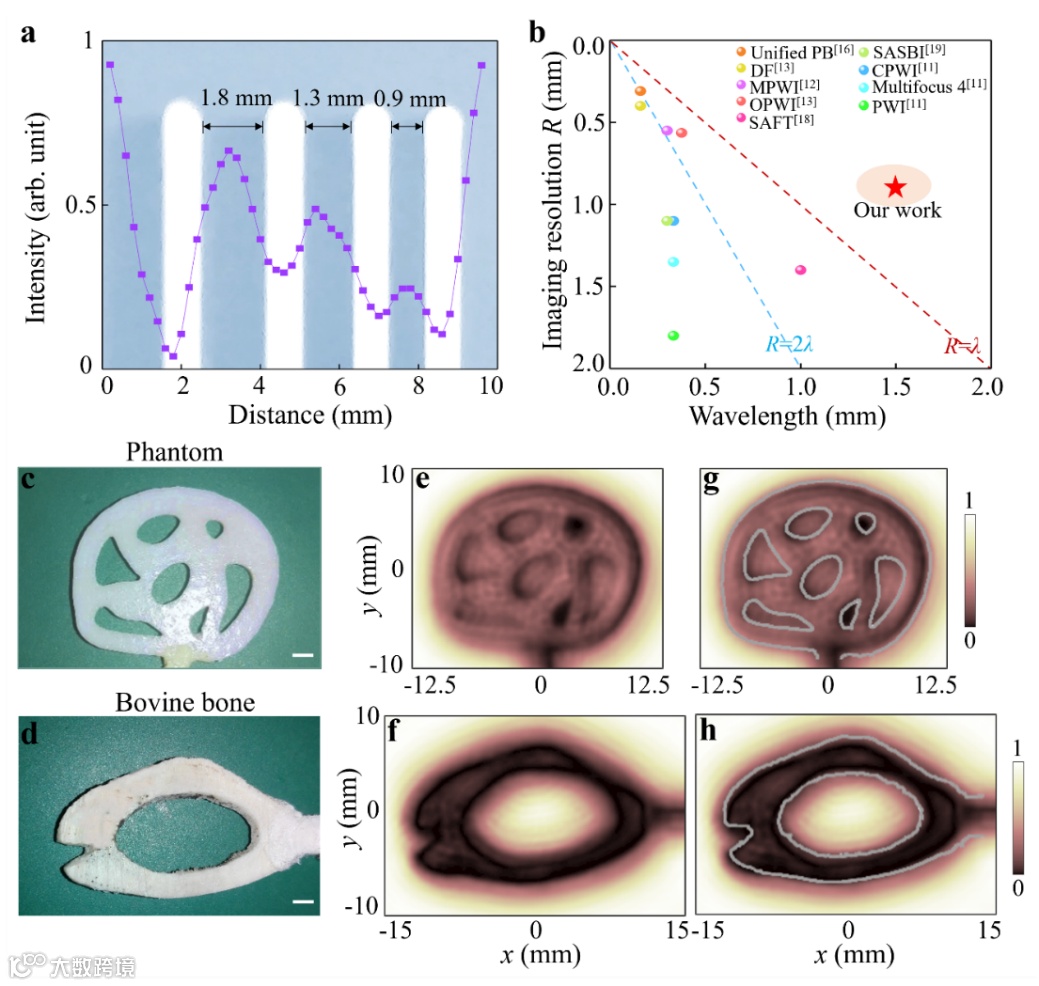 图2. 柔性超透镜实现亚波长超声成像分辨率的实验测量结果。a, 实验表征所设计的柔性超透镜成像分辨率,其可分别0.9 mm(1 MHz)间隔的物体; b, 本研究与部分已有研究中所实现的成像分辨率结果对比;c-d, 多空结构仿体样本及存在微裂缝的皮质骨组织切片样本;e-f, 对应样本的的超声图像;g-f, 在超声图像中映射样本几何轮廓,以对比成像准确度。