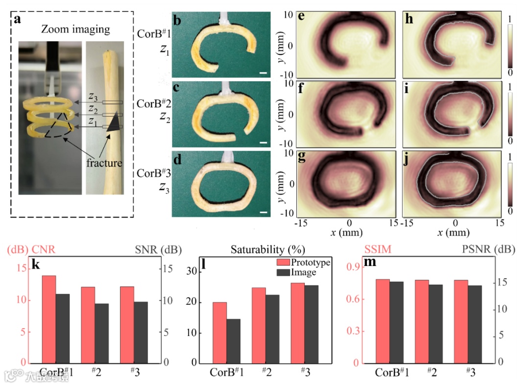 图3. 基于柔性超透镜超声成像的骨裂精准诊断。a, 实验装置照片;b-d, 3片具有不同缺损程度的皮质骨组织切片样本,其置于a中所示的3个不同位置以验证变焦成像效果。e-g及h-j, 对应的超声图像及与样本几何轮廓的映射图;k-m, 不同样本超声图像与真实样本的对比度噪声比(CNR)、信噪比(SNR)、图像饱和度(Saturability)、结构相似度(SSIM)及峰值信噪比(PSNR)等参数对比结果。