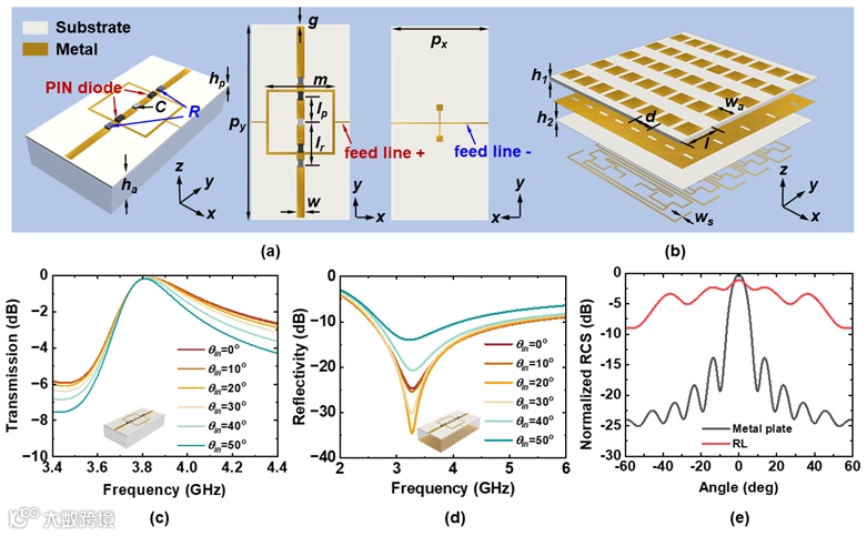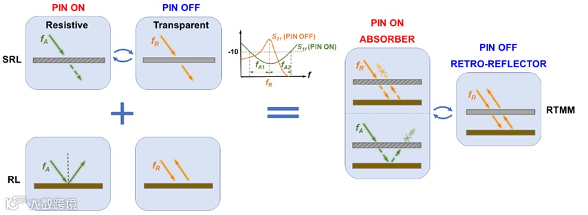 图2 三模式可切换超表面工作原理,超表面由可切换电阻表面(SRL)和回溯表面(RL)复合构成,通过嵌入的PIN二极管实时控制其工作模式。