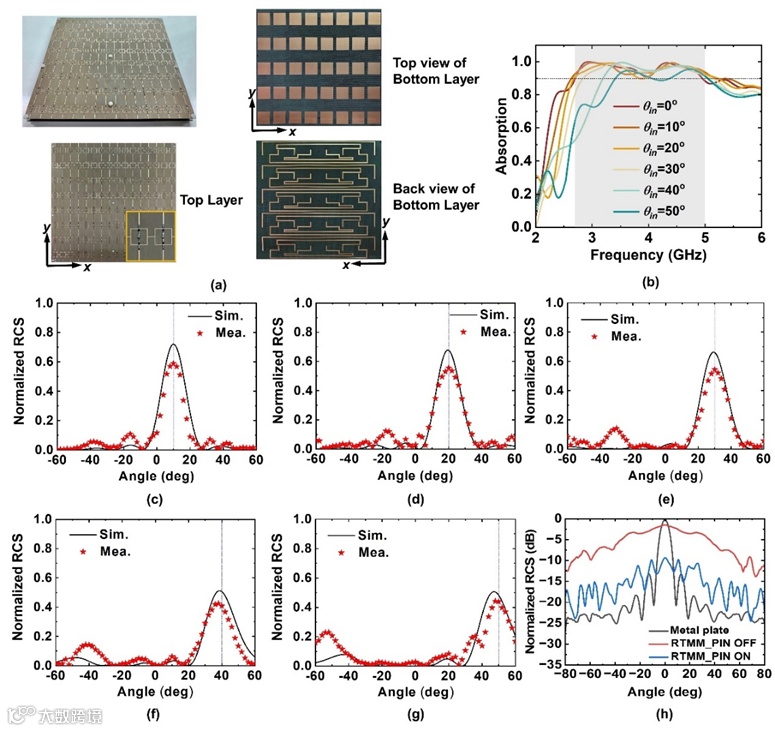 图5(a)超表面样品照片。(b)PIN二极管“ON”状态下,超表面在不同入射角下的电磁波吸收率测试结果。PIN二极管“OFF”状态时,不同入射角下的2D散射模式测试与仿真分析结果对比:(c)10°,(d)20°,(e)30°,(f)40°,(g)50°。(h)三种模式超表面单站RCS测试结果。