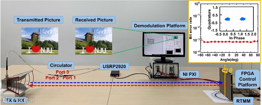 图6 基于三模式超表面构建的保密无线通信原型系统示意图及测试结果。