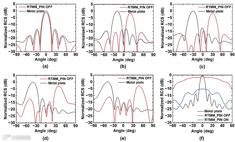 图4 二极管“OFF”状态时,3.85 GHz处超表面的2D散射模式与同等大小金属板的仿真分析结果对比: (a)0°,(b)20°,(c)30°,(d)40°,(e)50°。(f)超表面的单站RCS仿真分析结果。
