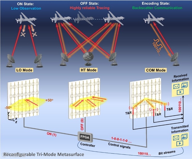 灵活操控电磁波是许多现代科学与技术应用中广泛追求的目标,如电磁散射调控、电磁能量吸收、无线通信等。在实际应用中,往往需要同时满足不同的需求,集成不同的电磁波调控功能。以无人机(Unmanned aerial vehicle, UAV)为例,它可能既需要高可探测能力,以确保通过特定电磁波进行远程自动监控和无线通信,同时也需要宽带、宽角度范围的低可探测性,以应对敌方雷达的电磁波探测。为了满足这种互相矛盾的技术需求,需要融合多种电磁波操控功能的可重构电磁器件和设备,通过不同功能之间的动态切换来处理多种任务需求,因此具有较大挑战性。