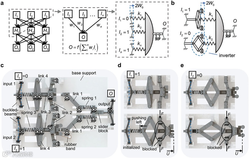 随着材料和制造技术的不断进步,机械计算系统能够以“感知-分析-驱动”一体化的方式处理环境信息,从而推动软体机器人和超构材料等智能机械系统的发展。人工神经网络(ANN)在执行计算机视觉和机器翻译等复杂信息处理任务方面取得了显著成就。将机械计算与人工神经网络相结合,有望进一步提高机械系统的智能。通过确定物理输入输出关系与人工神经网络常用数学模型之间的映射关系,在其他物理系统中也进行了类似的探索,从而开发出了物理神经网络。